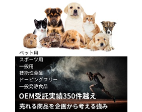 最小ロット [例]打錠・カプセルの場合で200箱~(応相談) 最小見積金額 打錠・カプセル・ドリンク・ゼリー・顆粒、どんな形状でも最低ロットからも対応 元 日本臨床食物機能研究会顧問の経験を活かし、商品企画、試作、製造、原料供給までワンストップで対応いたします。 ①初めての方でも安心して高レベルの開発が出来るようにサポート ②長年の経験実績に基づいた企画コンサルとスピード感ある情報収集 ③毎回相見積の手間と時間を削減 ④費用コストを抑えられるベストのご提案 ⑤豊富な種類の原料取扱い実績 ⑥どんな形状にも対応可 話題性のある健康・美容原料から、高いエビデンスを有する機能性成分まで幅広くご提案可能です。 「売れる商品」を最短で形にする 企画力 × 原料力 × 開発力 が当社の強みです。 打錠、顆粒、スティック、ドリンクなど多彩な剤型に加え、一般食品・ペット用・アスリート用OEMなどのご相談も大変増えております。 小ロット対応、原料サンプル・資料提供も可能です。 お気軽にお問い合わせください。