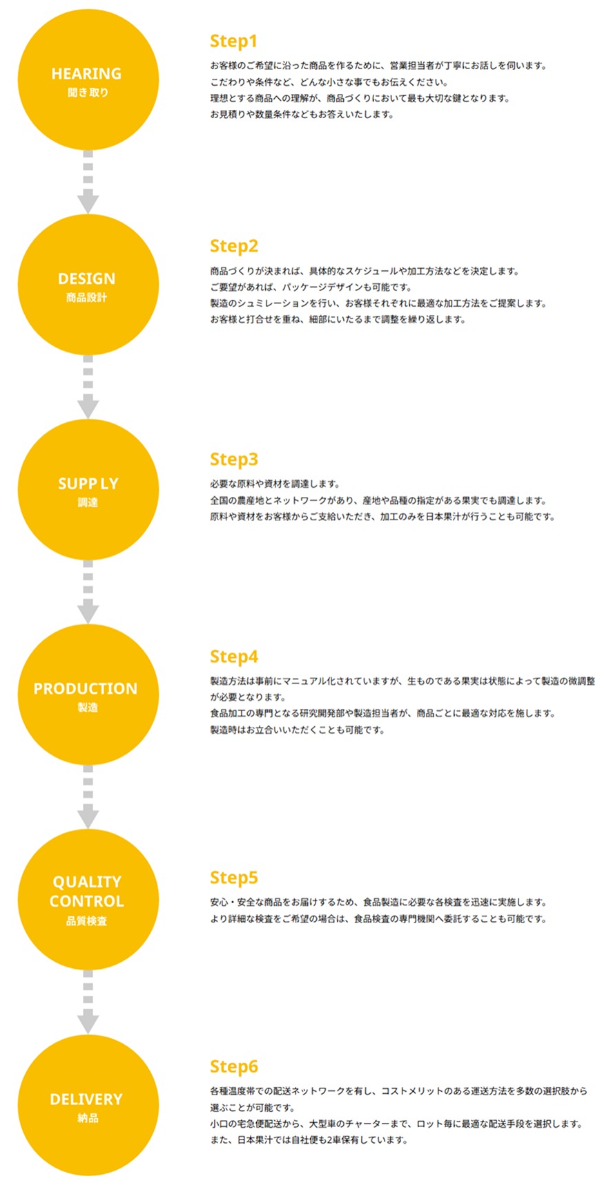 「この果実でこんな商品をつくりたい」 そんな思いを形にするお手伝いをいたします。 品種・産地を指定した果実の調達から、OEM製品の開発・提案までワンストップで対応いたします。 果実の魅力をそのままに、お客様のニーズに合わせた加工方法をご提案。 少量生産から大規模生産まで、多様な設備によりフレキシブルに実現可能です。 商品企画や流通まで含めたトータルサポートで、最適な解決策をご提案いたします。 ■果実加工方法一例 会社案内ダウンロード