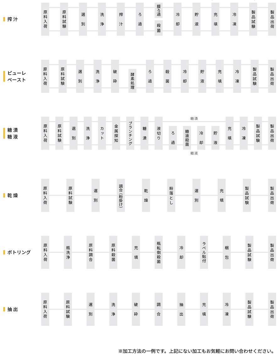 商品・サービス 糖漬け・乾燥 糖漬け・乾燥加工を行っており、果実の種類や状態に応じた適切な処理のノウハウを有しています。また、スライスやトリミングなどの加工にも対応しています。 ボトリング ボトリング(瓶詰め)を行っています。内容物の特性に応じた充填・殺菌方法により、品質を保った状態で製品化します。ジュースの他に、酒類の取扱も可能です。 搾汁・酵素処理 さまざまな果実の果汁搾汁や、果実(または果皮)を酵素処理したピューレの製造を行います。用途に合わせて、搾汁方法からご提案します。