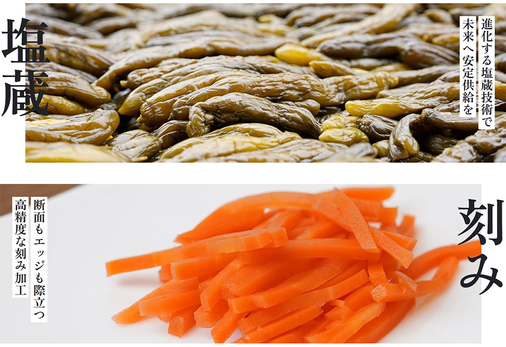 株式会社ミナミは、埼玉県深谷市を拠点に、塩蔵(漬物)原料の卸・刻み加工に特化してきた会社です。原料確保から国内自社工場での加工、出荷まで一貫対応し、高いカット技術ときめ細やかな管理体制で、お客様の商品づくりを支えています。食品ロス削減にも取り組み、誠実なものづくりを通じて社会に貢献してまいります。 国産・中国産の人参・胡瓜・茄子・大根・野沢菜などの塩漬け原料を取り扱っております。年間を通した円蔵スケジュール管理により、中長期的な安定供給に対応可能です。 刻み加工では、福神切り・千切り・銀杏切り・ひら切り・輪切り・ダイスカット・四つ割りなど幅広い加工に対応し、10種類以上の加工機械から適切な方法をご提案いたします。最小幅2ミリからの精密なカットや、お客様持ち込み原料の加工にも対応しております。