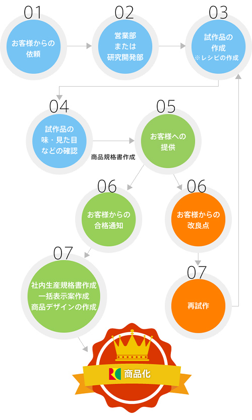 「おいしさ」を凝縮する「技術」で食卓に笑顔を運びます。 おいしいものをより手軽に選びたい・・・。 そう思うのは誰でも同じことです。 21世紀を迎えた今、缶詰製造の原理が発明されてから200年の技術を継承する缶詰食品メーカーとして、また、時代の変化に対応したレトルト食品メーカーとして、更なる飛躍を誓い、「技術」を「おいしさ」の中に凝縮してお客さまにお届けしたいと考えております。 そのまま温めても、ご家庭やレストランユーズでひと手間加えても、そして災害時には、つねにお客様へ「安全」に「おいしさ」をお届けする、そういう企業でありたいと願っております。 食肉・惣菜缶詰やレトルト食品(カレー等)はお任せください! 研究開発された商品を工場内にてロット生産するために、常に技術開発に励み商品の安定供給を実現しています。 「安心」「安全」で「おいしく」「新しい商品」を手にしていただけるような環境づくりを心がけております。 商品開発の流れ