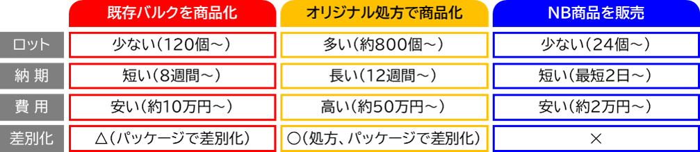 商品・サービス 【商品開発方法①】既存バルクを商品化 ①当社で開発した既存バルク(錠剤やカプセル)を選ぶ、②パッケージ(容器)を選ぶ、③デザインを決める、の3ステップで商品開発・販売が可能です。 【商品開発方法②】オリジナル処方で商品化 商品イメージやコンセプトをもとに配合する成分や量、最適な剤形などを決め、お客様だけの完全オリジナル商品を開発し、販売することが可能です。 【商品開発方法③】NB商品を販売 在庫は抱えず、まずは少量をテスト販売してみたいとお考えのお客様は、すでに商品化されたNB(ナショナルブランド)商品を仕入れて販売することが可能です。