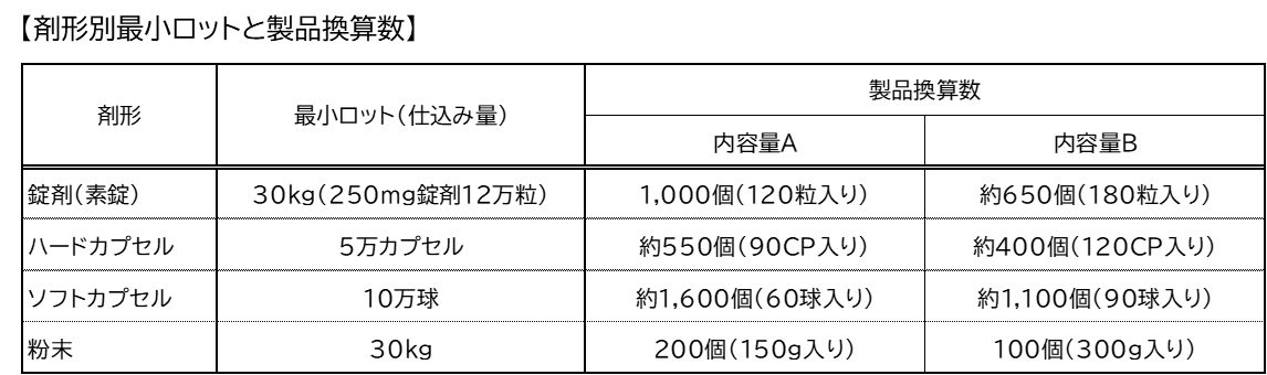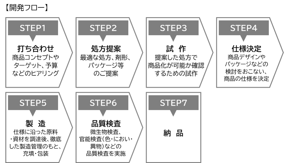 《差別化できる商品の提案》 6,000アイテム以上の健康食品・サプリメント製造のノウハウを活かし、他社と差別化できる商品をご提案します。 また、これまで蓄積してきたマーケティングデータや「サプリメント市場動向資料」、「オリジナルサプリメント企画書」なども活用し、市場トレンドや市場ニーズに合った商品をご提案します。 《在庫や初期投資を抑えられる提案》 オリジナル処方で商品開発をおこなう場合、大手受託製造会社だと数百kgでの仕込み量となるため、最終製品の数も多く、在庫リスクや費用負担が増えてしまいますが、当社では30kg~の仕込みが可能です。(素錠の場合) そのため、最終製品の数も大手と比べると少なくすることができ、初期投資も抑えることができます。また、内容量を増やすことで、製品単価は上がってしまいますが、製品数を少なくすることも可能です。 《お問い合わせへの迅速な対応》 サプリメントのお取り扱いが初めての企業様はもちろんのこと、すでにサプリメントをお取り扱いの企業様からのOEMに関する疑問・質問、お見積り依頼や試作品製造依頼など、お客様からのお問い合わせには、専門知識豊富な担当者が迅速かつ親切丁寧に対応します。 製品の企画から開発、製造、納品に至るまで、お客様の信頼できるパートナーとして、全力でサポートします。 OEMお問い合わせ 取り扱い企業 TK製薬株式会社 都心からのアクセスにも便利なさいたま市で、お客様が求める製品を「スピーディー」に「高品質」に「創造的」に実現します。 所在地 〒 337-0024 埼玉県さいたま市見沼区片柳864-1 [MAP] TEL: 048-646-5005 FAX: 048-687-4416 健康食品・サプリメント製造会社