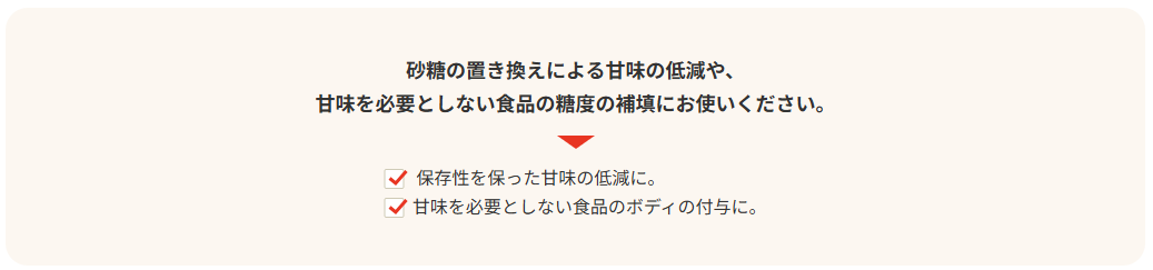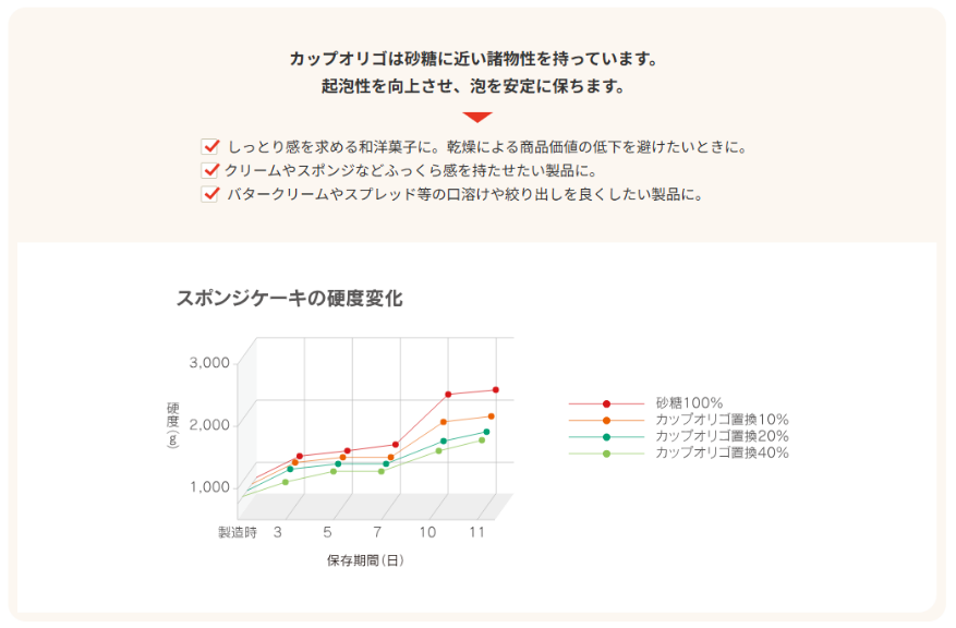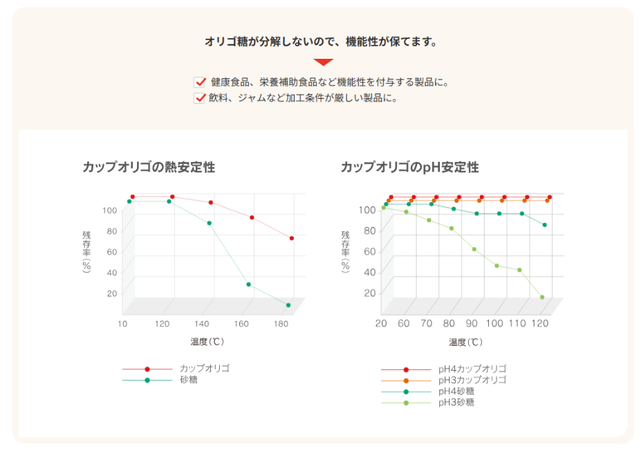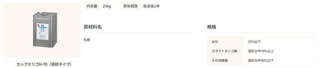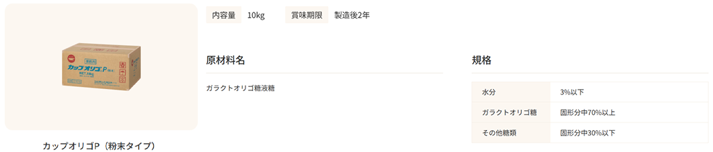 カップオリゴとは、牛乳の中に含まれる乳糖を原料に、当社が独自に開発したオリゴ糖です。 ビフィズス菌増殖促進物質として有効なガラクトオリゴ糖を主成分とする食品用糖質で物性面に優れ、 しかも母乳にも含まれる素材で安心です。 健康志向の食品素材として御社の製品づくりにご利用ください。 カップオリゴの主成分であるガラクトオリゴ糖は4′-ガラクトシルラクトースをはじめ、右図の構造式で示されるオリゴ糖の混合物です。 これらのオリゴ糖は、牛乳に含まれる乳糖に酵素を作用させてつくられます。 カップオリゴの生理作用 カップオリゴの主成分であるガラクトオリゴ糖にはさまざまな生理作用が確認されています。 ①腸内フローラ改善効果 ガラクトオリゴ糖は、腸内に棲息している有用菌の代表とされているビフィズス菌を選択的に増加させます。 ② 消化吸収されにくく低カロリー ガラクトオリゴ糖は、小腸の消化酵素でほとんど分解されず大腸まで届きます。カロリーは砂糖のほぼ半分です。 ③虫歯の原因になりにくい糖質 ガラクトオリゴ糖は、虫歯の原因菌であるミュータンス菌に利用されず、また歯垢の原因となる 不溶性グルカンの生成もないことが確認されています。 ④ その他の生理作用 ガラクトオリゴ糖についてのさまざまな研究から、以下の生理機能が確認されています。 ・カルシウムやマグネシウムなどのミネラル類の吸収を助けます。 ・血液中の総コレステロールや中性脂肪を減らし、善玉コレステロールの比率を高めます。 カップオリゴの特徴 ①安定性 カップオリゴの主成分であるガラクトオリゴ糖は砂糖に比べてきわめて安定で、180℃で加熱してもほとんど分解しません。 ガラクトオリゴ糖はpH3という酸性条件で加熱してもほとんど分解せず、また室温保存しても100日以上安定です。 ②保湿性 カップオリゴは保湿性が強く、食品や菓子類の保存にも好ましい影響を与えます。 ③甘味質と甘味度 カップオリゴは上質でさわやかな甘味を有し、甘味度は砂糖を100とした場合に25です。甘味度の温度変化はありません。 甘味度が低くさっぱりしているため、従来の糖質の置き換えによる甘味低減の他、 甘味を必要としない食品にも、味に影響を与えることなくご利用いただけます。 カップオリゴのさまざまな特性を活かして、利用範囲は無限大です。 商品ラインナップ ・カップオリゴH-70(液状タイプ) ・カップオリゴP(粉末タイプ) <最小ロット> ・カップオリゴH-70:25kg ・カップオリゴP:10kg OEMお問い合わせ 取り扱い企業 ウェルネオシュガー株式会社 糖のチカラと可能性を切り拓き、“Well-being”を実現する精製糖業界のリーディングカンパニーを目指します。 所在地 〒 103-8536 東京都中央区日本橋小網町14-1 住生日本橋小網町ビル [MAP] TEL: 03-3668-2422 一般食品製造会社