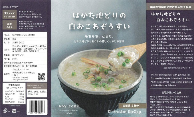 筑紫野市で生まれたブランド鶏はかた地どりと、筑紫野市で収穫されたもち米を使用した白おこわ雑炊です。 地元の気候や土壌に育まれた特産食材を組み合わせることで、筑紫野市の魅力を一杯で味わえる地域グルメとして仕上げました。 もち米で作った白おこわをベースにしているため、一般的な雑炊とは異なるもっちりとした食感が楽しめます。 さらに、はかた地どりの豊かなコクと旨味が出汁に溶け込み、素材の美味しさを引き立てるやさしい味わいに仕上げました。 白おこわと雑炊を組み合わせた「おこわ雑炊」という新しい発想の商品で、他にはない食感と味わいを楽しめる珍しいおこわ系レトルト商品です。 地元の恵みを活かした、筑紫野市ならではの贅沢な一杯です。 OEMお問い合わせ 取り扱い企業 合同会社エニクック エニクックは、ANY(何でも)COOK(創る)という名の通り、想いを形にする食のクリエイターです。 所在地 〒 818-0011 福岡県筑紫野市阿志岐133-1 [MAP] TEL: 092-917-8299 FAX: 092-917-8298 レトルト食品製造会社 /有機JAS認証事業者 /JFS認証企業