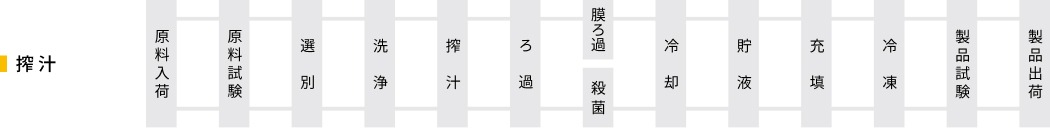 こだわりの搾り方 ストレート果汁の他に、透明果汁(UF 膜ろ過)、濃縮果汁(混濁・透明)の製造も可能です。果汁歩留まりを重視する場合や、搾汁後の果皮の活用を想定した場合など、ご要望に応じて搾汁方法を選択します。 搾汁の流れ OEMお問い合わせ 取り扱い企業 株式会社日本果汁 これまでに取り扱った国産果実は250種類以上。 果汁やペースト・オイル等の販売から、果実原料の小〜大ロット製造まで幅広く対応いたします。 所在地 〒 600-8428 京都府京都市下京区弁財天町331 [MAP] TEL: 075-644-5817 FAX: 075-344-2112 原料加工会社